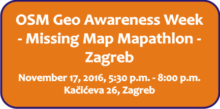 OSGL Geodetskog fakultetaHrvatsko kartografsko društvo i IT-sekcija Studentskog zbora Geodetskog fakulteta pozivaju Vas na druženje i učenje u sklopu OsmGeoWeek radionice na kojoj ćemo kartirati u OpenStreetMapu za humanitarne svrhe
